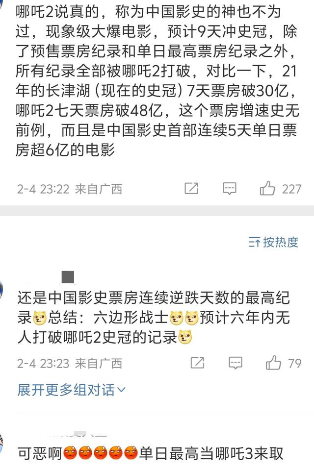 现象级大爆剧,创造了中国影史单日票房连续破6亿的纪录,都到了8亿了。虽然已经收假了,感觉这个纪录还得超,因为按这种火爆程度,上映时间还得延期,好多没有看过的人去看,去看过的人二刷三刷四刷